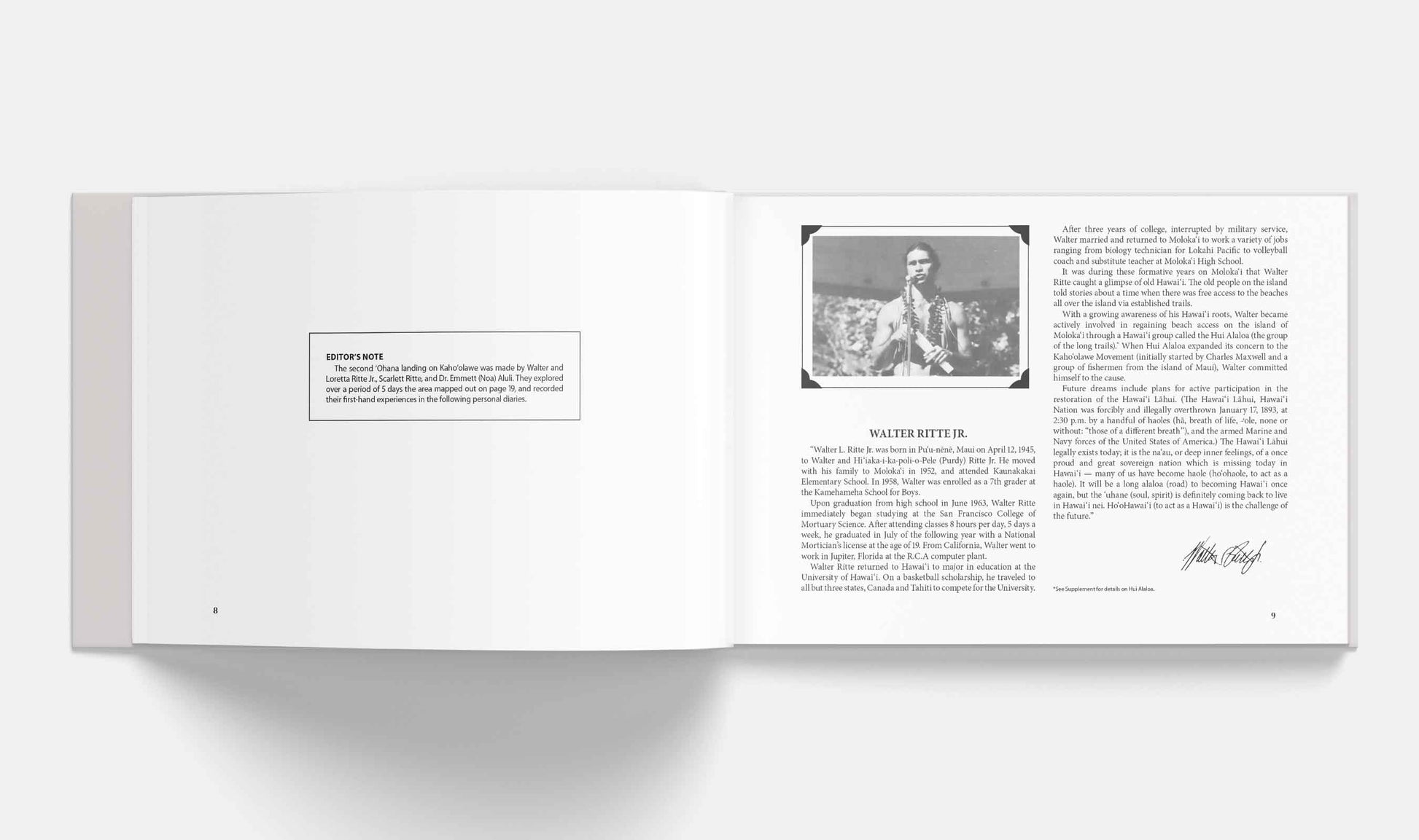 Na Manaʻo Aloha o Kahoʻolawe provides the reader with background on the events leading up to and including this very important historical event from a first-person perspective, through letters and diaries kept by the two men before, while on Kahoʻolawe, and after their removal from the island. Insights into their daily life on-island are shared along with their motives, actual events occurring around them (on the island) as well as off the island and most importantly, the connections continuing between the ‘aina (land), the ‘akua (gods) and their understandings of this historic movement. It also includes thoughts from George Helm, who was lost at sea off Kahoʻolawe when attempting to find Walter and Richard, as well as other young Hawaiians who had been touched by the island and were also ready to occupy Kahoʻolawe.